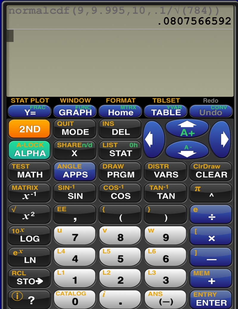 A random sample of 784 10-ounce cans of fruit nectar is drawn from among all cans produced in a run. prior experience has shown that the distribution of the contents has a mean of 10 ounces and a standard deviation of .10 ounce. what is the probability that the mean contents of the 784 sample cans is less than 9.995 ounces?