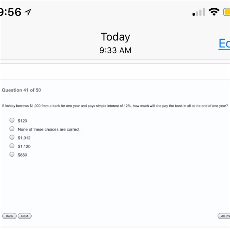 If Ashley borrows $1,000 from a bank for one year and pays simple interest of 12%, how much will she pay the bank in all at the end of one year?