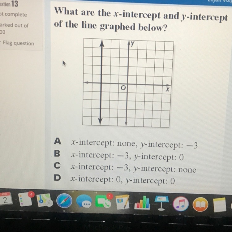 The x-intercept is where the line crosses the x-axis. The x-axis is horizontal. It crosses the line three left from the origin, or (0,0). This is -3. The x-intercept is -3. The answer would be either B or C. The line never hits the y-axis, so the y-intercept is none. The answer is C.