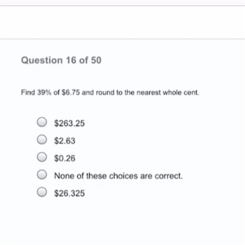 Find 39% of $6.75 and round to the nearest whole cent.