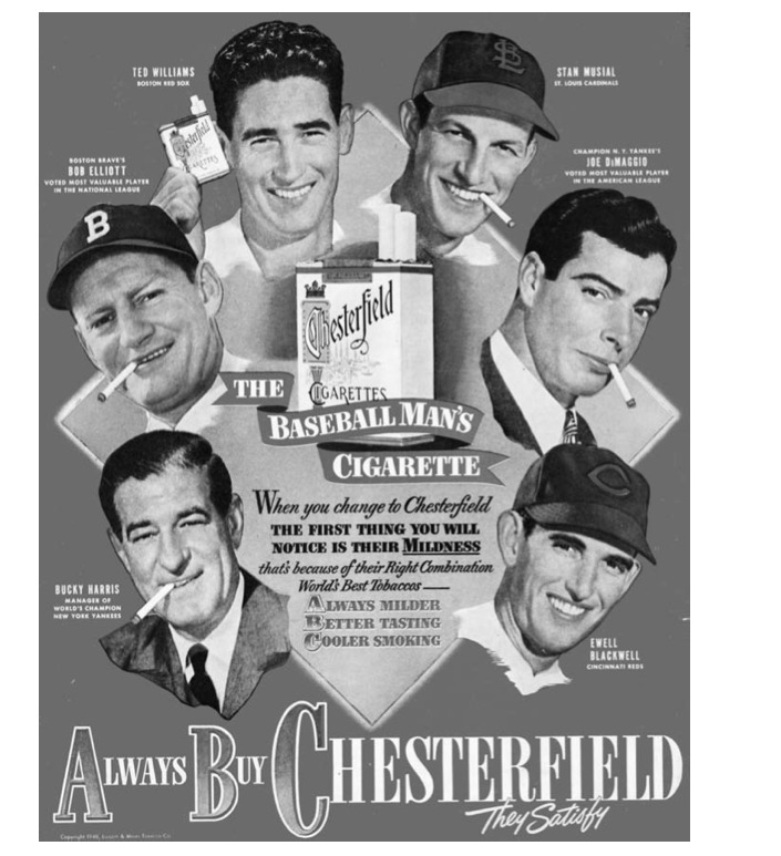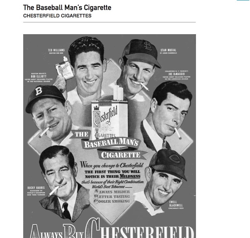 1- Appeals can be devided into, at least, three categories according to Aristotle's rhetorical appeals (ethos = ethics, pathos = emotions, logos = logics). Using this parameter, this add clearly uses pathos as it appeals to different feelings and needs that many people have for acceptance and popularity, and satisfaction. Here you see a consensus of admirable people (baseball players like Bucky Harris, Bob Elliott, Ted Williams, etc.) who use this product, which may lead you to believe that, by using their product, you can look like them. It's also stated in the add that Chesterfield is World's Best tobaccos, which can appeal to people's need for status (if you're smoking the best cigarrette, people will look at you with admiration over the next person who smokes a regular cigarrette, right?)