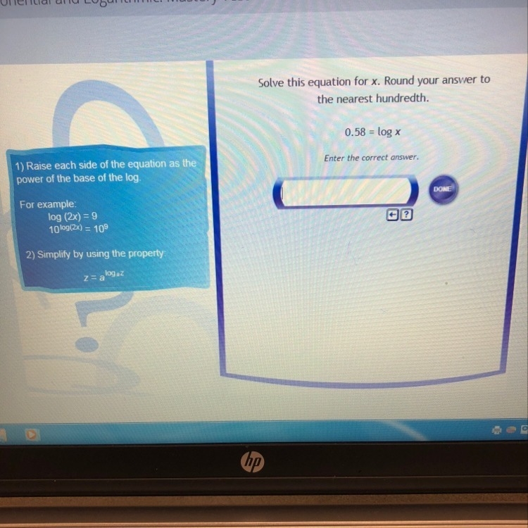 Ansswer: 3.80Step-by-step explanation1) Given equation: 0.58 = ㏒ x
