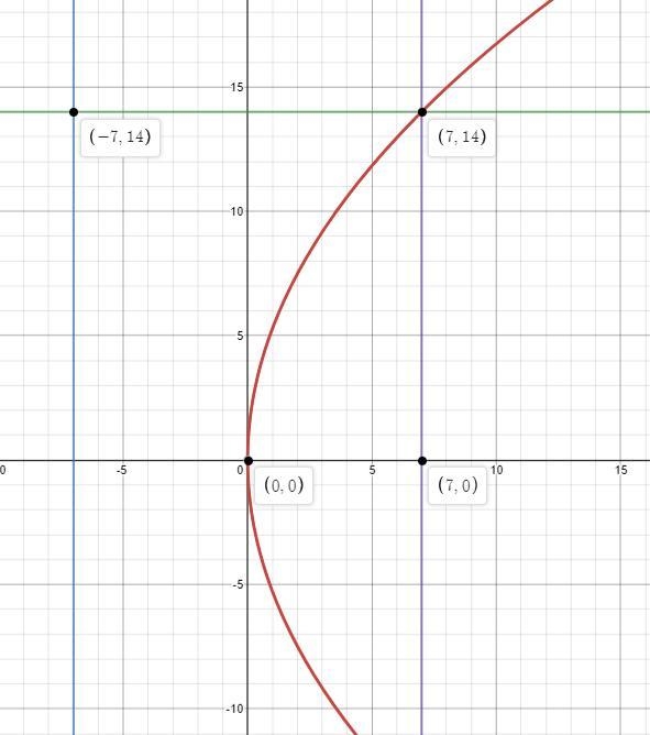 The focal point needs to be equidistant from the directrix, which in this equation is -7 = x. With the focus being at (7, 0), at point (7, 14) as an example, it is 14 units away from the focal point, and subsequently 14 units away from the directrix, which is at -7 = x.