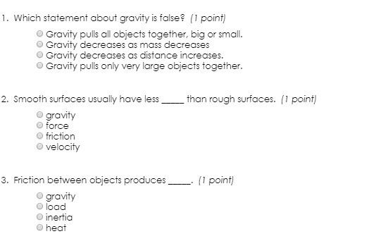 1. false is Gravity pulls on very large objects only ( gravity pulls on everything, not just large objects)