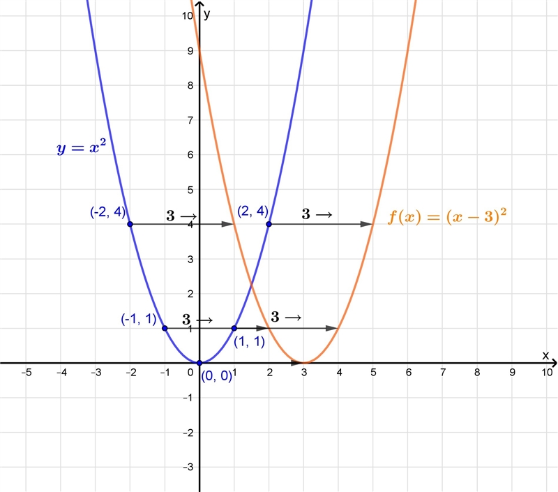 How is the graph of f(x)=(x-3)^2 is related to the graph of f(x)=x^2?