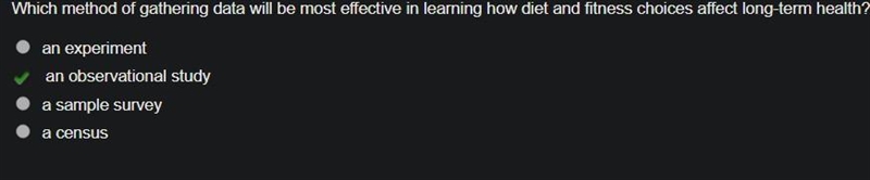 Which method of gathering data will be most effective in learning how diet and fitness choices affect long-term health? A. An experiment B. An observational study C. A sample su…