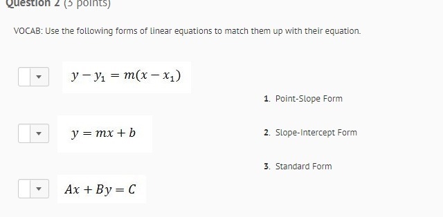 The first one is standard form , the second one is slope intercept form and the last one is point slope form