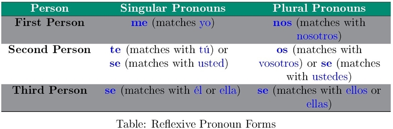 Reflexive verbs are used when someone performs an action to or for himself/herself. Put another way, the subject of the verb and the direct object of the verb are the same person. This verb is always accompanied by a Reflexive Pronouns. These pronouns are indicated in the Table below. Therefore: