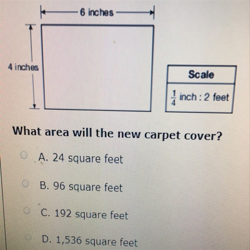 We need to apply a scale factor to our current dimensions. The scale factor is for every 1/4 inch, we have 2 feet. This means for 4 inches, we have 32 feet. For 6 inches, we have 48 feet.