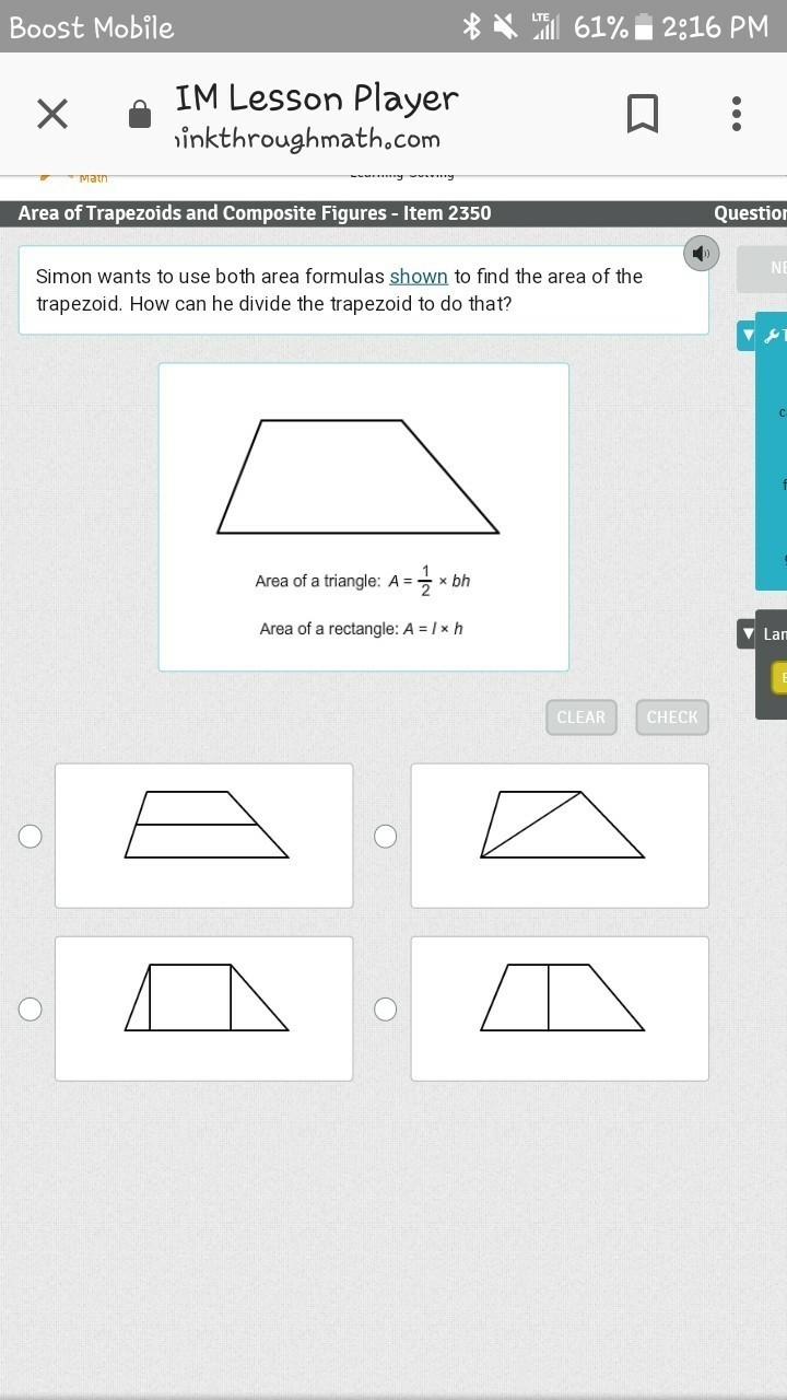 Simon wants to use both area formulas shown to find the area of the trapezoid. How can he divide the trapezoid to do that?