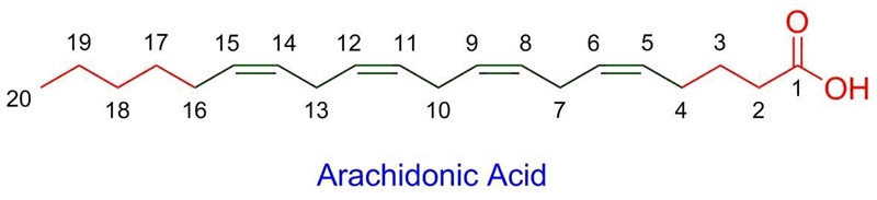 Arachidonic acid (5z,8z,11z,14z-eicosatetraenoic acid) is an eicosanoid, a fatty acid containing 20 carbon atoms. it is the precursor of the prostaglandins and leukotrienes, important signaling molecules. draw the line-bond structure of arachidonic acid. clearly show stereochemistry where appropriate.