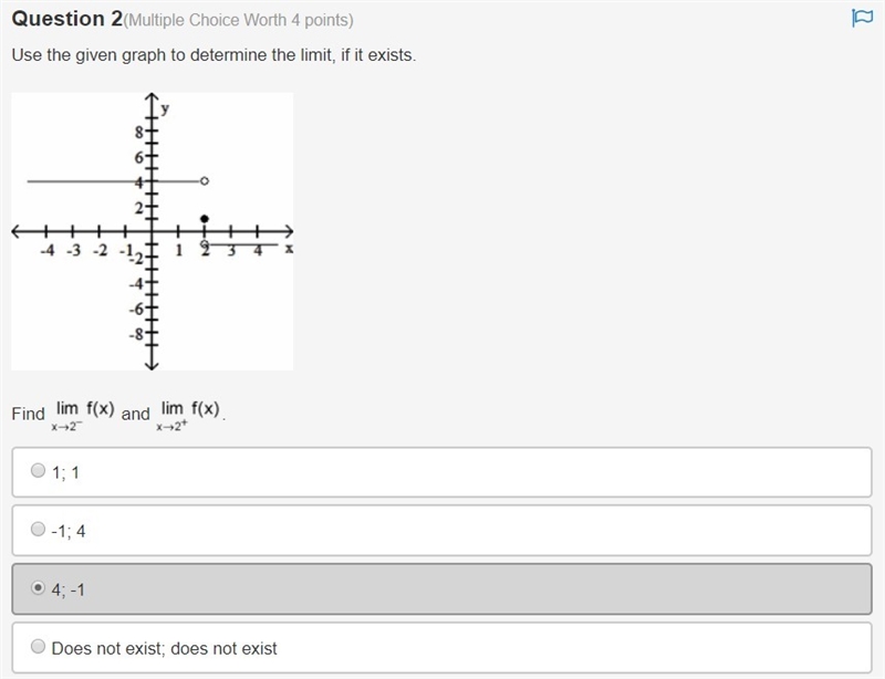 If you are approaching 2 from the left you would be looking at the graph for values of x<2. So you would be "traveling" on that straight, horizontal line that crosses the y-axis at 4. The line y=4. Even though the graph at x=2 does not equal 4, if you are coming at it from the left you are walking along the line and approaching 4. The limit is 4.