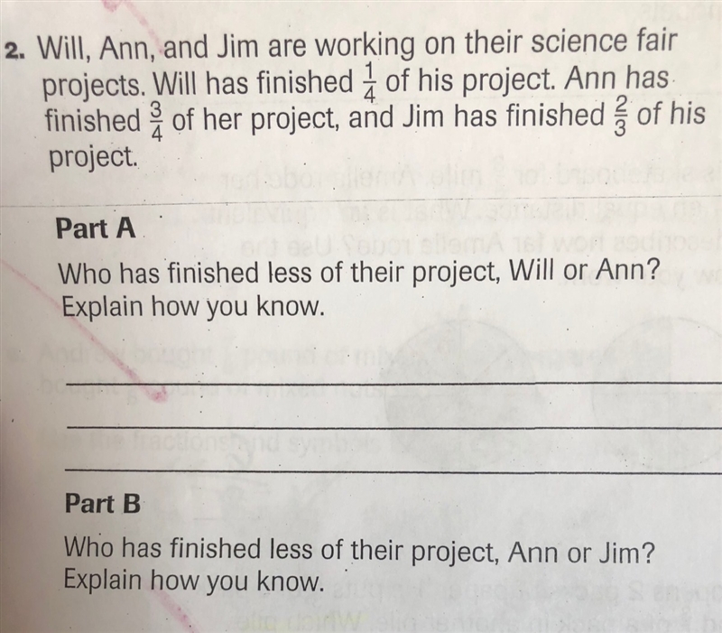 For Part B Jim has finished less of his project because when you make equivalent fractions 3/4 is equal to 9/12 and 2/3 is equal to 8/12 and 9/12 is greater than 8/12 so Jim has finished less of his project.