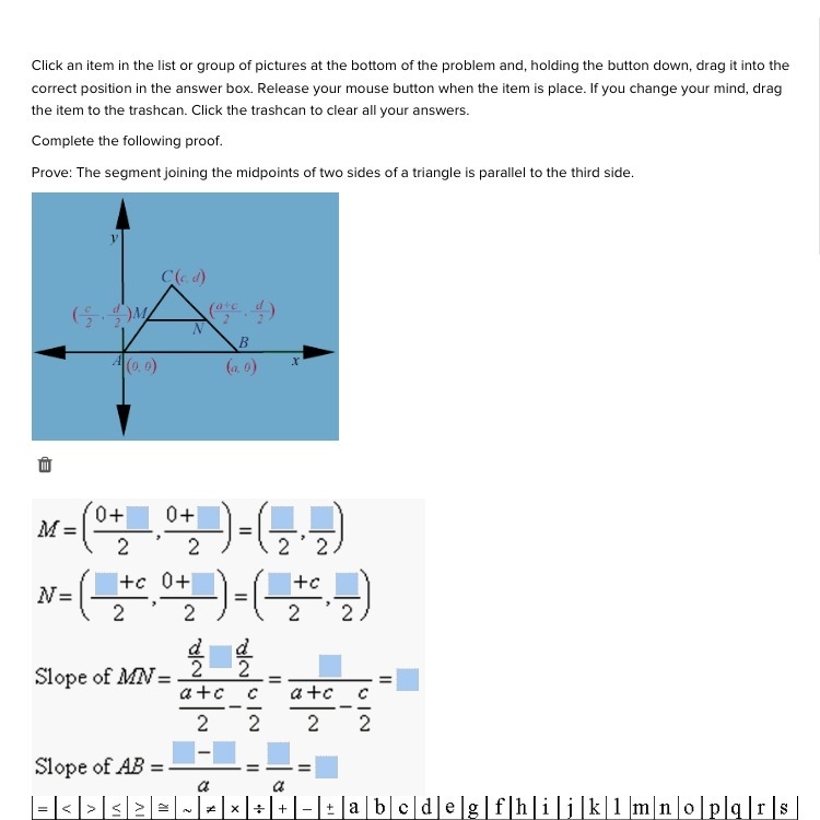 Click an item in the list or group of pictures at the bottom of the problem and, holding the button down, drag it into the correct position in the answer box. Release your mouse button when the item is place. If you change your mind, drag the item to the trashcan. Click the trashcan to clear all your answers.