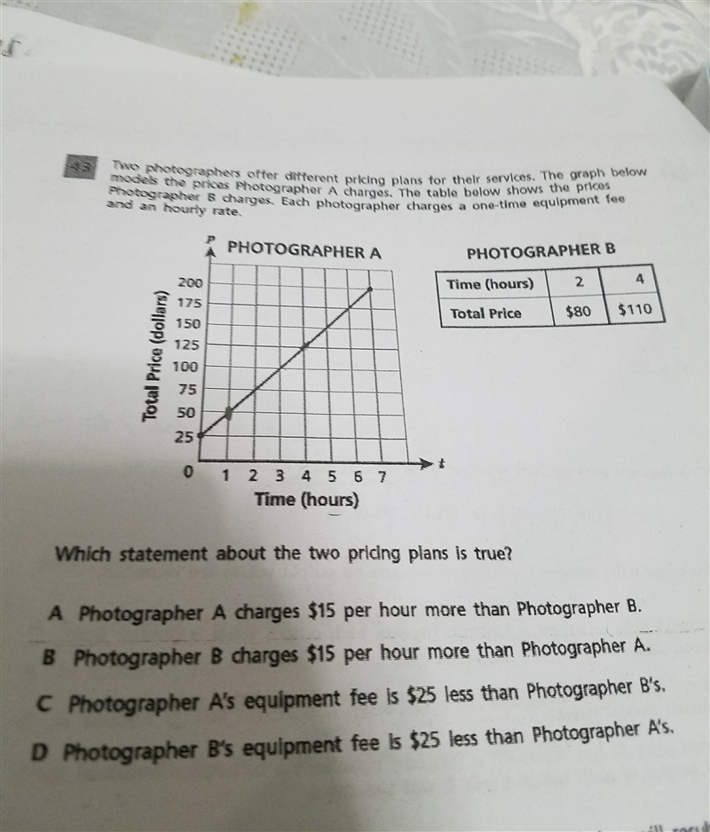C. Photographer A’s equipment fee is $25 less than Photographer B’s