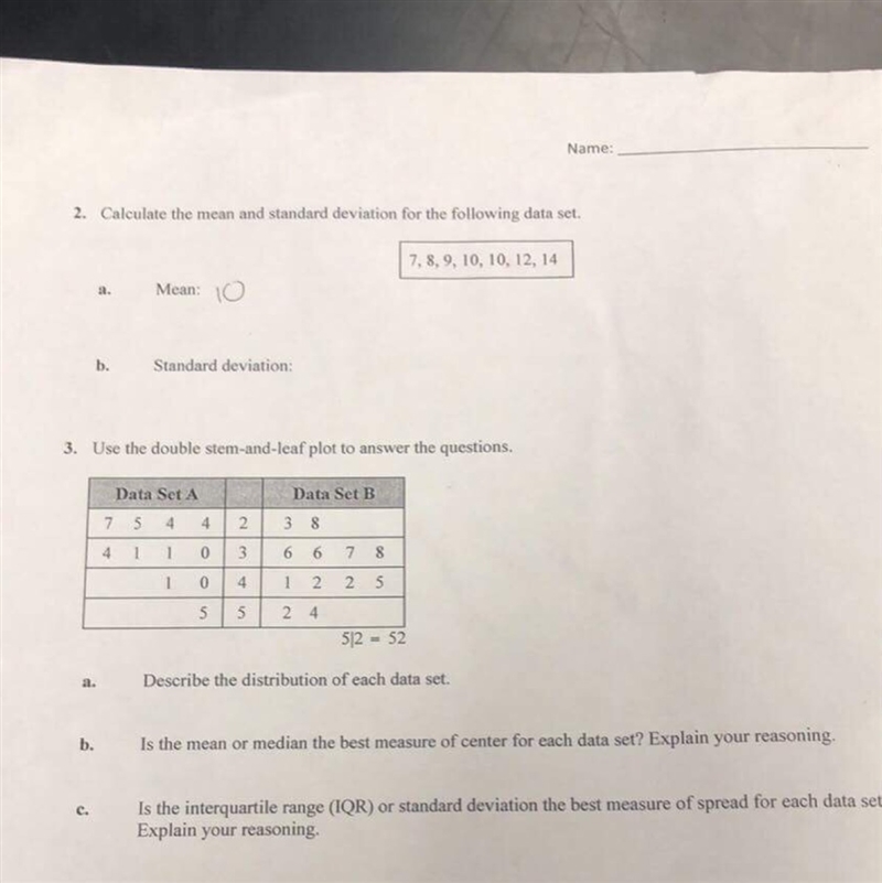 3c. The interquartile range would be better for Data Set A since the IQR is not affected by outliers and Data Set A has an extreme value (55) while the standard deviation would do just fine for Data Set B since the data is normally distributed therefore the standard deviation could be properly interpreted.