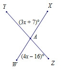 4x - 16 = 3x + 7 [vertical angles are equal]
