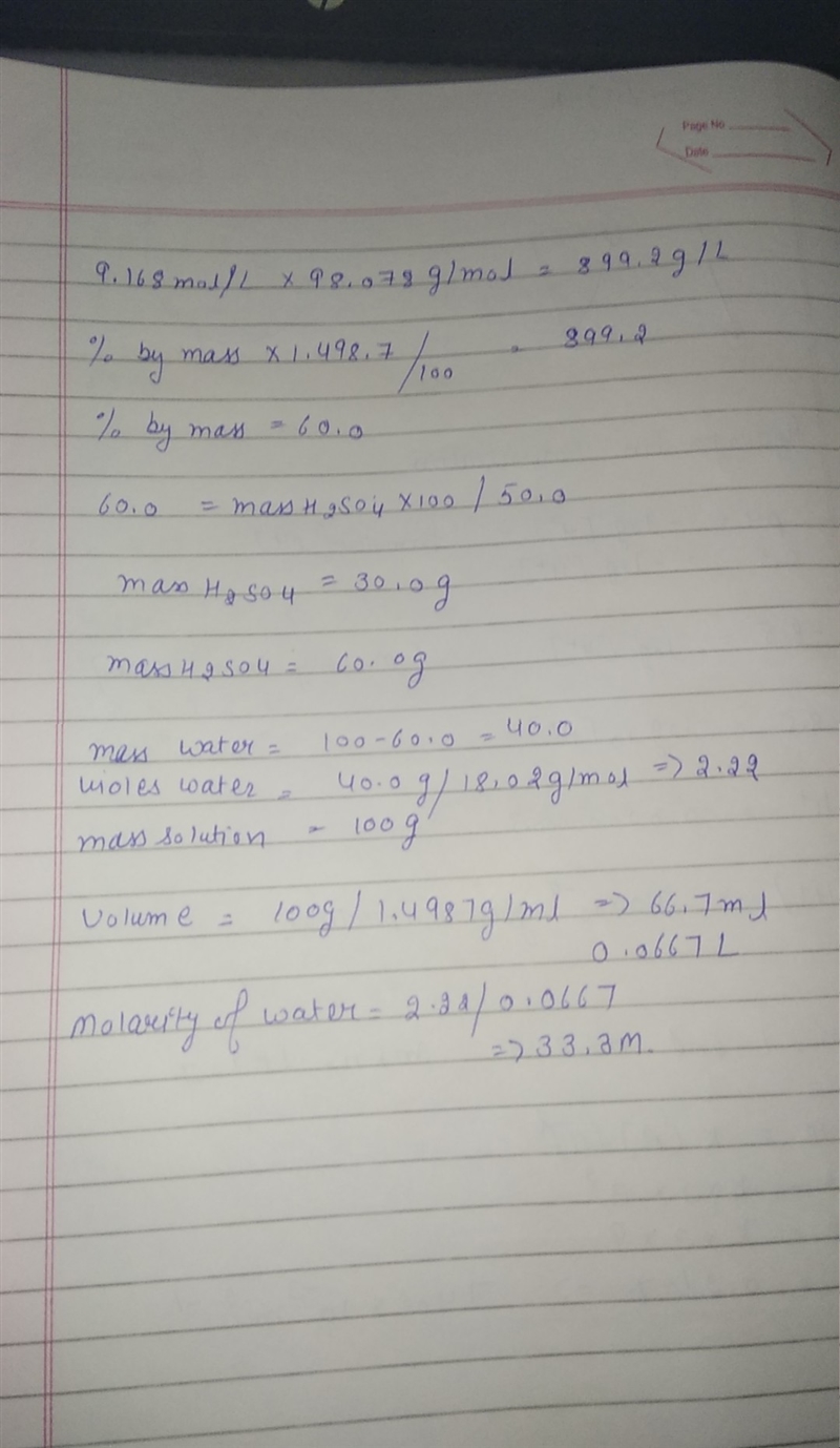 A 9.168 M aqueous solution of h2so4 has a density of 1.4987 g/mL at 20°. How many grams of h2so4 are in 50.0 g of this solution?