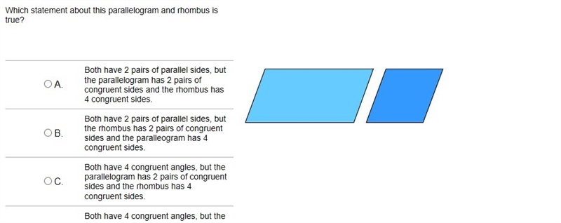 The properties of a parallelogram apply to a rhombus. The rhombus has 4 congruent sides, however. The parallelogram has two sets of parallel sides, not all congruent (equal)