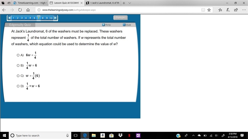Therefore, when we say 1/4 of the total washers (assuming w is the total amount of washers), we mean that 1/4 the total amount of washers represents how many have to be fixed. That would give us: