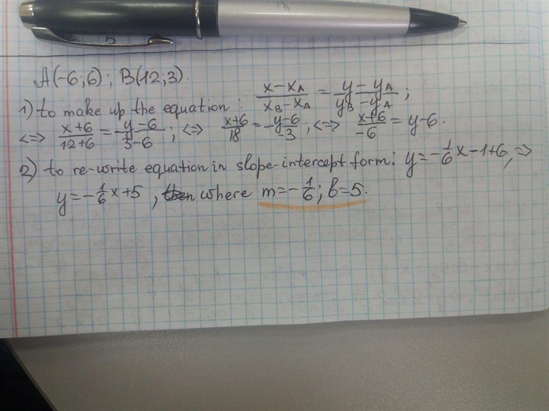 Line AB passes through points A(–6, 6) and B(12, 3). If the equation of the line is written in slope-intercept form, y = mx + b, then m = – and b =