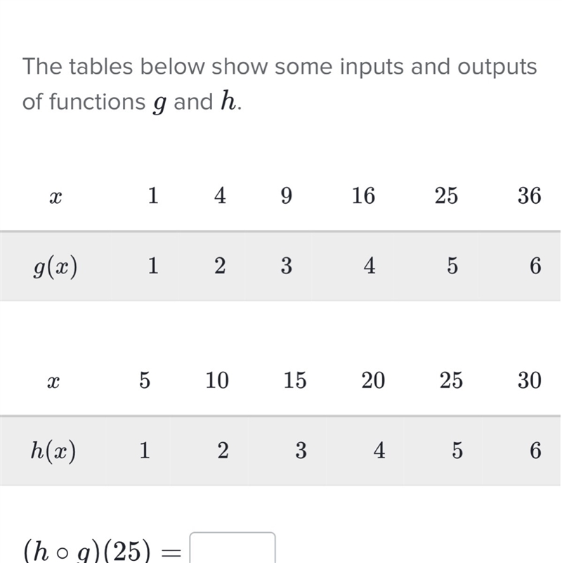 If the input to this function is 25 (as shown in the problem), the output of g(x) is 5. This 5 becomes the input of h(x) , which takes on the value 1.