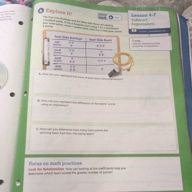 A) Every T is worth 7 points, and every F is worth 3 points. So if we let T = 7 and F = 3, we can count how many T's and F's each team scored and write it as an expression.