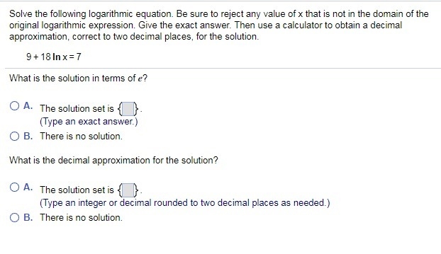 Q4 Q7.) Solve the following logarithmic equation. Be sure to reject any value of x that is not in the domain of the original logarithmic expression. Give the exact answer. Then use a calculator to obtain a decimal approximation, correct to two decimal places, for the solution.