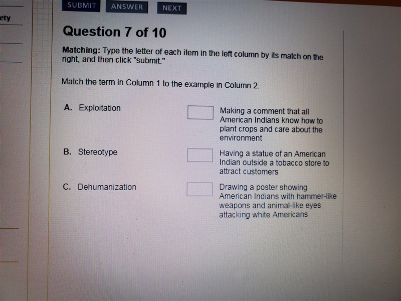 Letter A means that the indigenous image has been exploited for marketing. Letter B means a stereotype because it is not true to say that all indians are only people who care about the environment, they are much more than that. And, letter C means that indians are compared to animals and, therefore, are not human beings, which is a dehumanization.