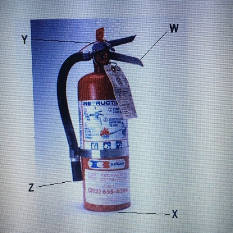 Which part of fire extinguisher should be pointed at a fires source A) W B) X C) Z D) Y