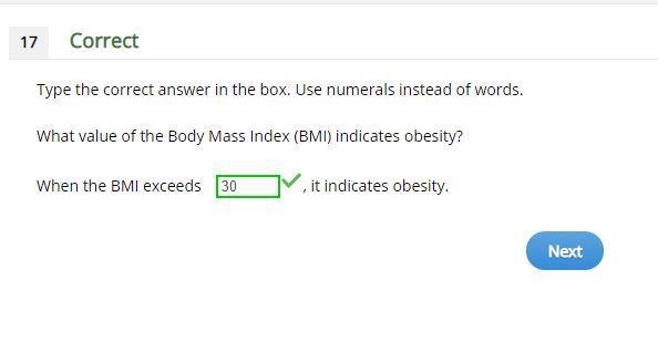 Which of the following body mass index (BMI) values defines class 1 obesity? 1.30. 2.25. 3.40. 4.35.