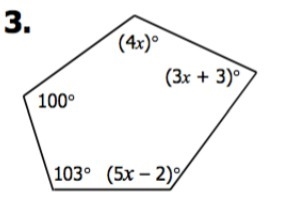 Using the formula - n-2*180 -, we know that the interior angles of a pentagon add up to 540. We can use the values we're given and add them together and set them all equal to 540, then solve.