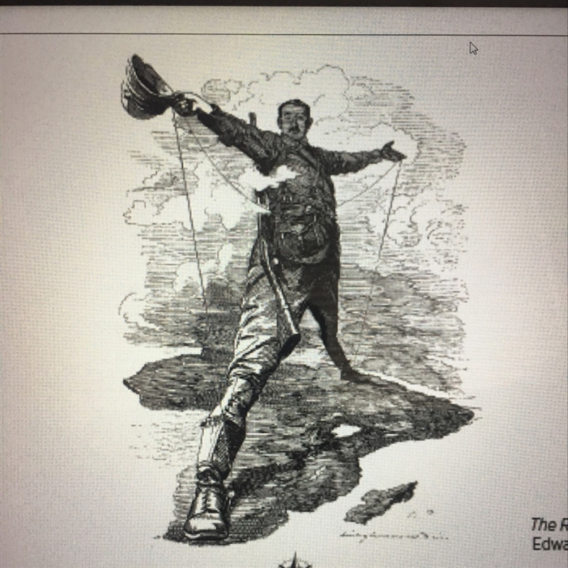 This manis a British colonist 'land-grabbing' Africa. The strings look like chains that bond people (slavery). He is on Africa to colonize it for resources for Great Britain.