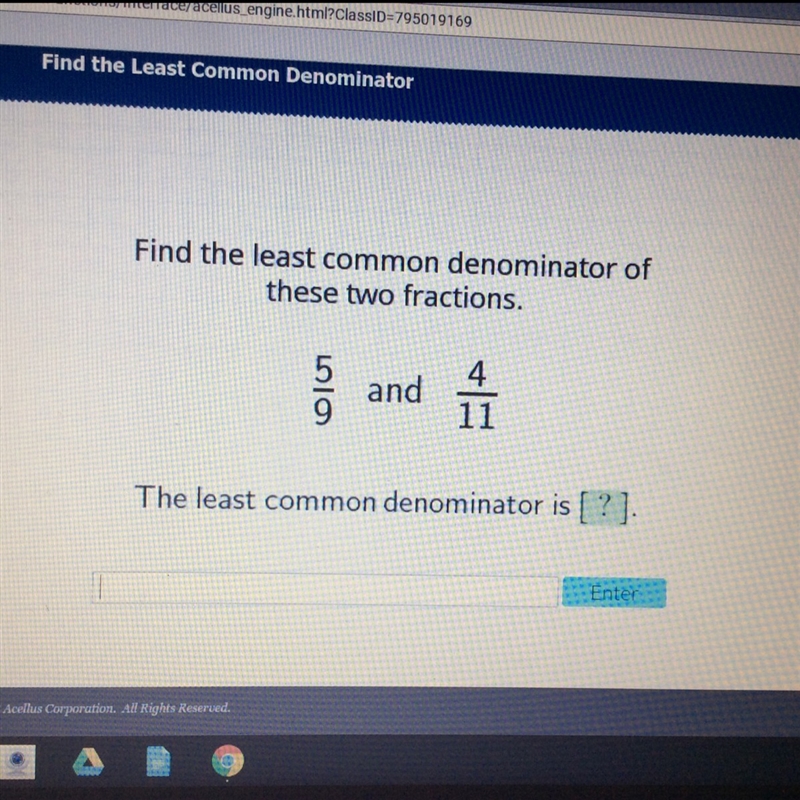 To add fractions, find the LCD - lowest common denominater, and then Combine. For LCD find where both bottom numbers equal the same so in this case you would have to multiply 9 times 11 and vice versa to equal 99. Once you do that the 5 thats on top of the 9 will also have to be multiplied by 11 and the 4 on top of the 11 will have to be multiplied by 9 so it could make sense. Now you must Combine - it would be 55/11 + 36/11. you only add the top numbers and leave the bottom number.(that is what its out of). Thus the answer is 91/11.