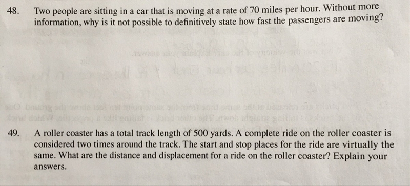 49. A roller coaster has a total track length of 500 yards. A complete ride on the roller coaster is considered two times around the track. The start and stop places for the ride are virtually the same. What Are distance and displacement for the ride on the roller coaster? Explain your answer