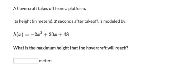 the answer id 12 meters.divide -2x^2+20x+48 by 2 to get x alone and then umbrella