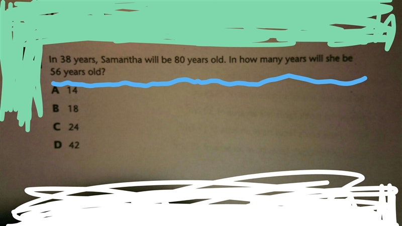 In 38 years, samantha will be 80 years old. in how many years will she be 56 years old?