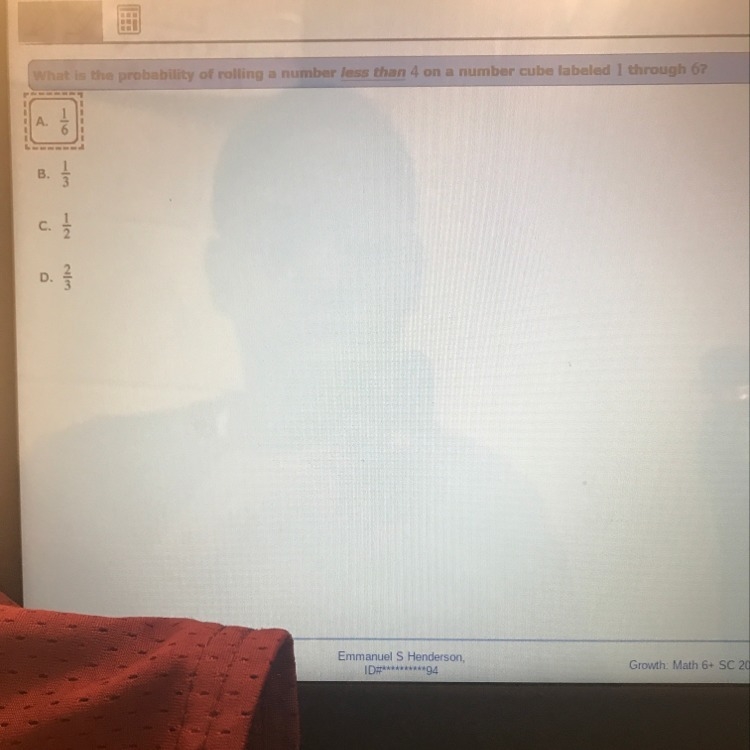 4. Basically there are only 3 numbers under 4. So the answer would be 3/6 simplified, which is 1/2.