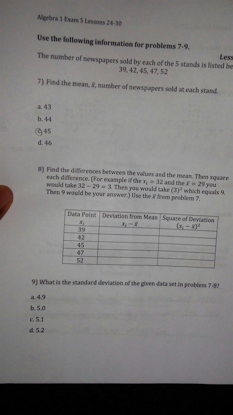 Find the differences between the values and the mean. then square each difference 39 42 45 47 52