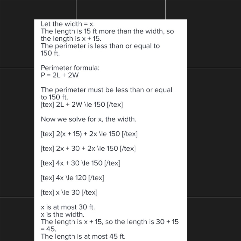 2x+2*[x+15] <=150--------> 2x+2x+30 <=150----> 4x <=150-30
