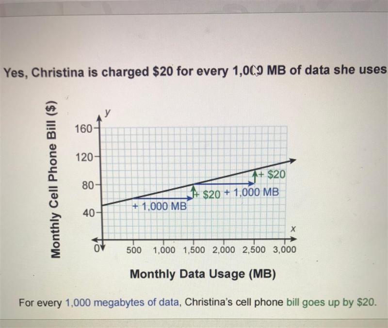 B) Christina is charged $20 for every 1,000 MB of data she uses.