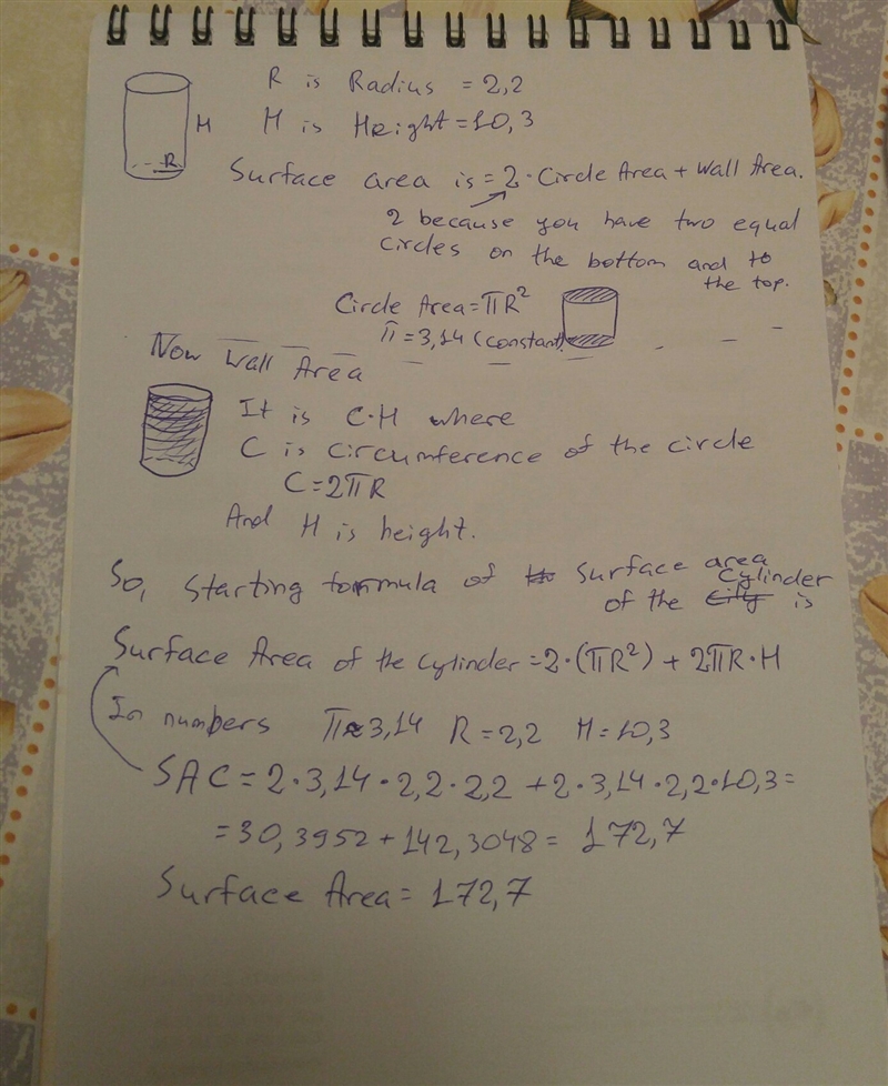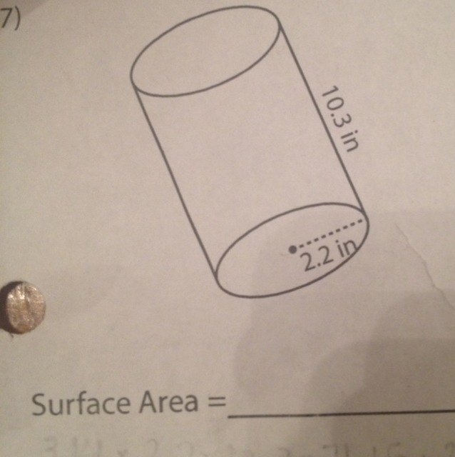 Surface area I think is the circle. So the formula to find the area of the circle is to do Pi times radius squared. Pi= 3.14 Radius in this case will be 2.2. (Radius is how much it measures out from the middle.) then you want to do 2.2 x 2.2 (since it's square) So the answer would be equal to (I think) 15.1976
