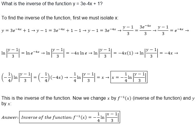 Therefore, the inverse function is f-1(x) = -ln((x - 1)/3) / 4.
