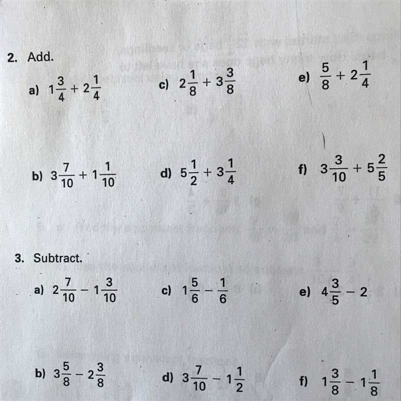 Hi. If you need me to explain please tell me so I will edit this comment. I'll just solve the answers for you... basically if they have a common denominator just add/ subtract, and if they don't, make it so they do by multiplying the same on each side.