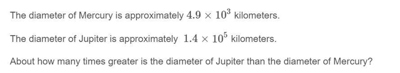 The diameter of Mercury is approximately 4.9×10^3 kilometers. The diameter of Jupiter is approximately 1.4×10^5 kilometers. About how many times greater is the diameter of Jupit…