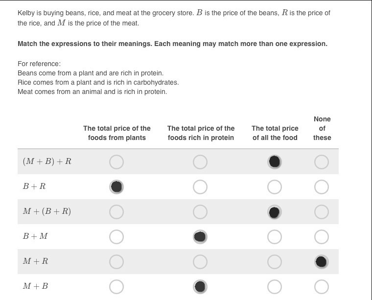 Row 2. Here you have the sum Beans+Rice. Since both foods are plants, the expression represent the total price of the foods from plants.