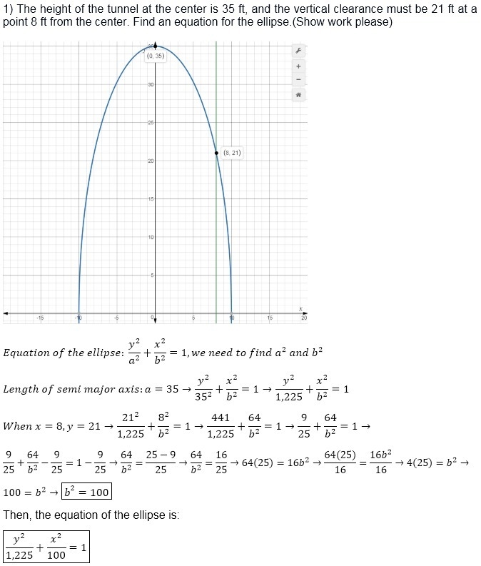 1)The height of the tunnel at the center is 35 ft, and the vertical clearance must be 21 ft at a point 8 ft from the center. Find an equation for the ellipse.(Show work please)