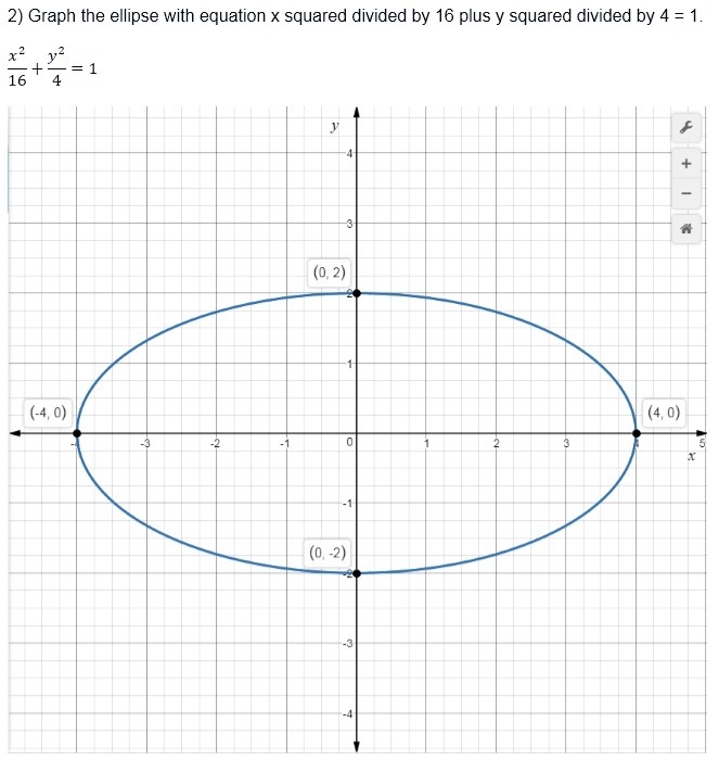 2)Graph the ellipse with equation x squared divided by 16 plus y squared divided by 4 = 1.