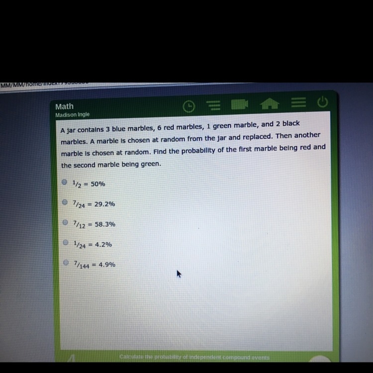 a jar contains 3 blue marbles 6 red marbles 1 green marble and 2 black marbles. a marble is chosen at random from the jar and replaced. then another marble is chosen at random. find the probability of the first marble being red and the second marble being green