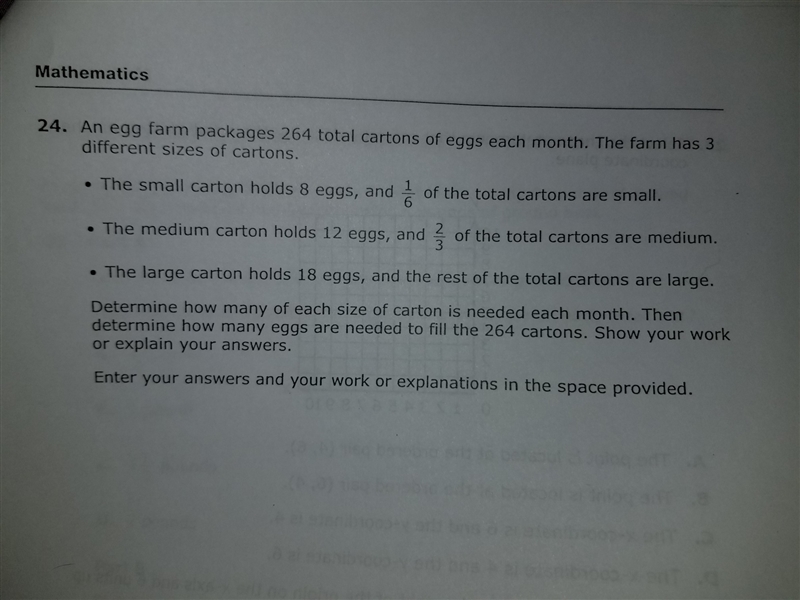 There are 264 cartons in total and 1/6 of these are small, 2/3 are medium and the rest are large, thus: